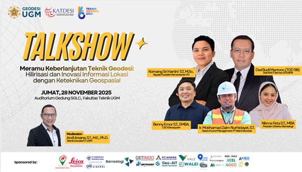 Yogyakarta, 28 November 2025 — Departemen Teknik Geodesi, Fakultas Teknik Universitas Gadjah Mada (FT UGM) terus memperkuat perannya dalam pengembangan dan pemanfaatan teknologi geospasial sebagai fondasi pembangunan berkelanjutan. Komitmen tersebut diwujudkan melalui penyelenggaraan kegiatan bertajuk “Geospasial untuk Semua: Meramu Keberlanjutan Teknik Geodesi melalui Hilirisasi dan Inovasi Informasi Lokasi”, yang dilaksanakan pada 28 November 2025.